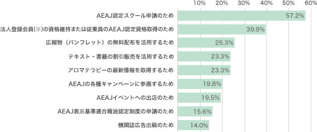 AEAJ認定スクールの運営や従業員のAEAJ資格取得といった会員特典が具体的な入会の動機となっています。また、パンフレットの無料配布やテキスト・書籍の割引販売なども大きな動機のひとつです。