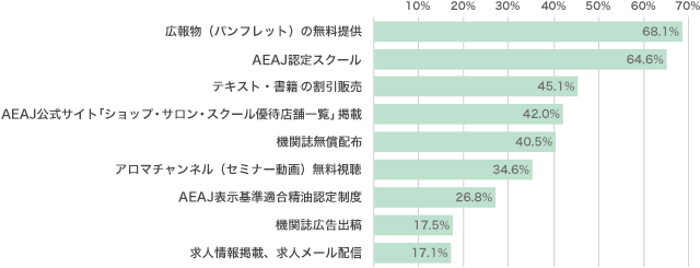 パンフレットの無料配布は、店舗やイベント・セミナーなど幅広く活用されています。また、AEAJ認定スクールやAEAJ表示基準適合精油認定制度、機関誌への広告出稿など、法人正会員限定の特典も多く活用されています。ショップ・サロン・スクール一覧への掲載、セミナー動画の視聴や求人情報掲載などの無料特典も人気です。