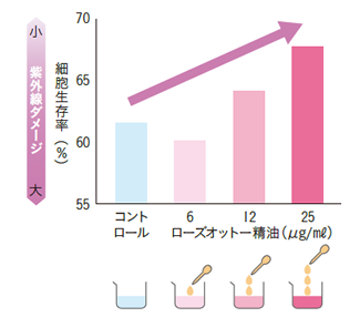 ローズオットー精油の量が増えるに従い、紫外線による細胞ダメージが有意に緩和されています。
