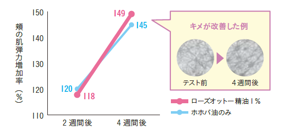 ローズオットー精油を1%に希釈したホホバ油を、1日1回、4週間、40歳前後の女性(44名)に使用していただきました。