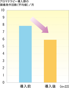 アロマテラピー(芳香浴)を導入した群では、導入前後を比較すると、導入しない群と比べて頭痛発作回数が有意に減少しました。