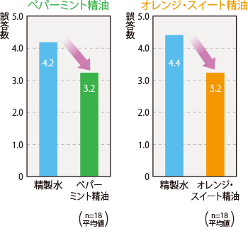精製水を嗅いだ場合と比較して、ペパーミント精油またはオレンジ・スイート精油を嗅いだときのほうが、計算ミスが少なくなる傾向が見られました。