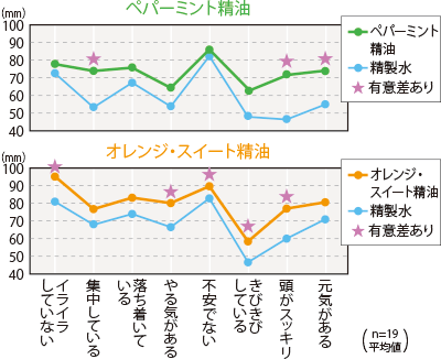 ペパーミント精油では、精製水と比較して、「集中している」「頭がスッキリ」「元気がある」が有意に増加し、オレンジ・スイート精油では、「イライラしていない」「やる気がある」「不安でない」「きびきびしている」「頭がスッキリ」が有意に増加しました。