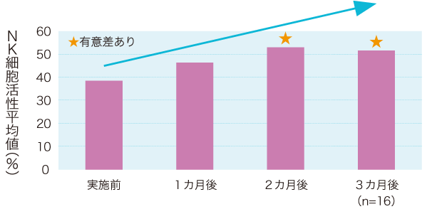 免疫機能の指標の一つ。NK細胞活性値の変化により免疫賦活効果を検証しました。
