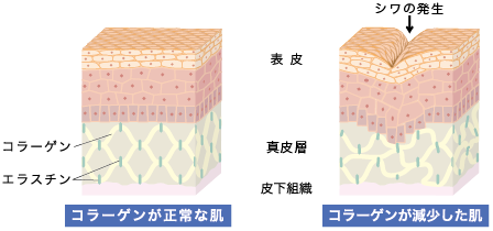 皮膚の構造は、表皮の下に真皮層があり、真皮層はコラーゲンとそれを束ねるエラスチンで構成されています。コラーゲンの産生が活発に行われると、弾力性に優れたハリのある肌が維持されますが、コラーゲンが減少すると表皮のハリが失われ、シワやたるみ、キメの乱れなどにつながります。コラーゲンは紫外線や活性酸素によって変成し、加齢とともに産生される量が減少します。
