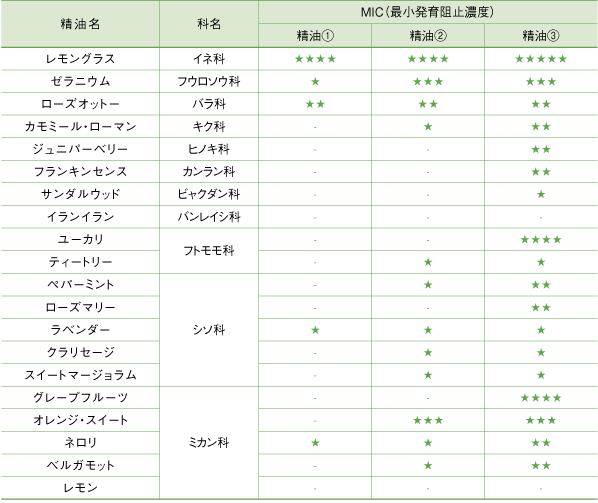 | 方法 | マイクロプレートを用いた「微量液体希釈法」により、界面活性剤の有り無しそれぞれの条件のもと、各精油についてMICを算出。 |