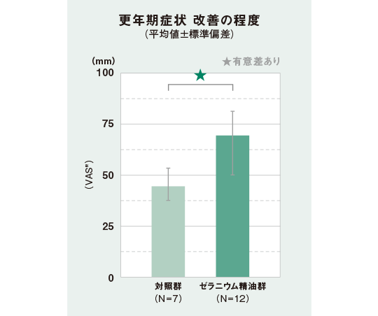 医師の問診により実験前と実験後の更年期症状の程度を比較したところ、ゼラニウム精油群は対照群に比べて更年期症状の改善の程度が有意によい結果となった。