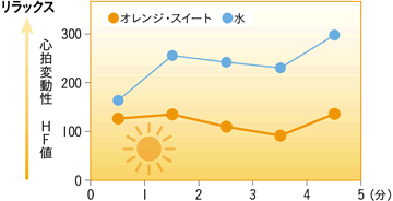 眠りが浅いといわれる高齢者を対象に、就眠前にオレンジ・スイートの香りを嗅いで就寝してもらったところ、香りのない水と比較して、就眠前の副交感神経活動が有意に増加しました。さらに、就寝中も居室内にオレンジ・スイートの香りを漂わせ続けたところ、香りのない水と比較して、翌朝、起床後の副交感神経活動が有意に低下しました。これは起床後に覚醒度がアップし、すっきり目覚めていることを示しています。
