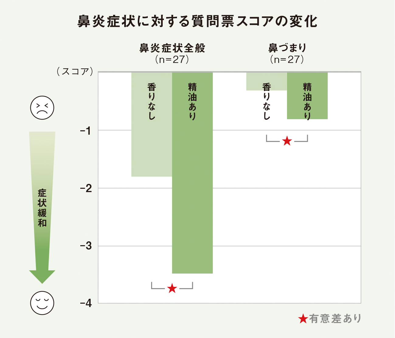 鼻炎症状全般、特に鼻づまりのスコアについて、精油の吸入をした場合、香りなし(スイートアーモンド油)に比べて、スコアが有意に減少しました。これにより精油の吸入が、通年性アレルギー性鼻炎症状を緩和する可能性が示唆されました。