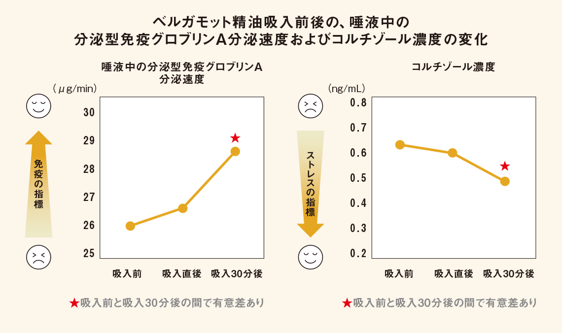 ベルガモット精油を芳香(弱)で噴霧した場合において、吸入30分後の唾液中のSIgA分泌速度が有意に増加し、コルチゾール濃度の低下が確認されました。これにより、ベルガモット精油の芳香浴が、免疫機能とストレス緩和に有用である可能性が示唆されました。