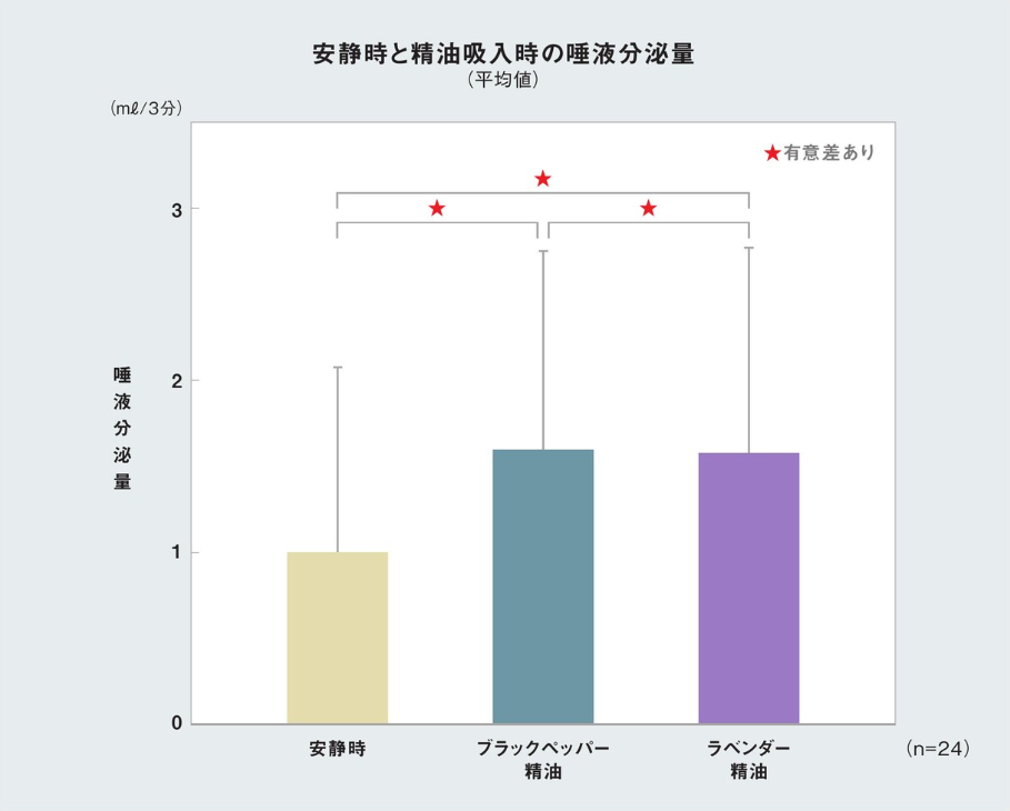 ブラックペッパー精油、ラベンダー精油の芳香浴により、安静時と比べて唾液の分泌量が有意に増加しました。また、精油同士で比較すると、ブラックペッパー精油のほうが有意に増加しました。