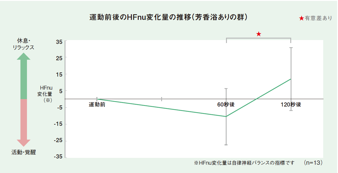 一方、芳香浴なしの群は運動120秒後も交感神経が有意な状態が継続した。
