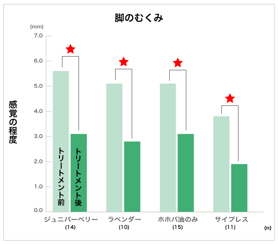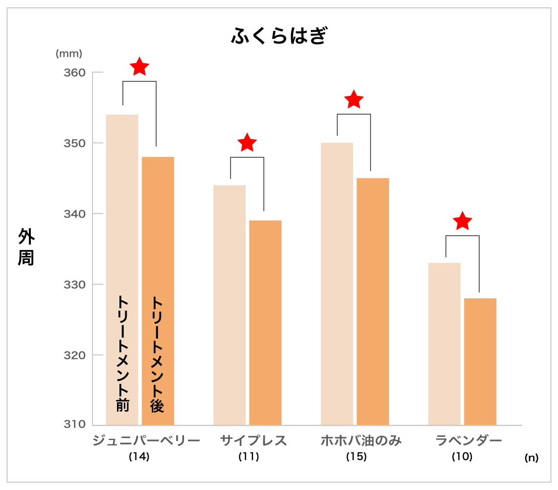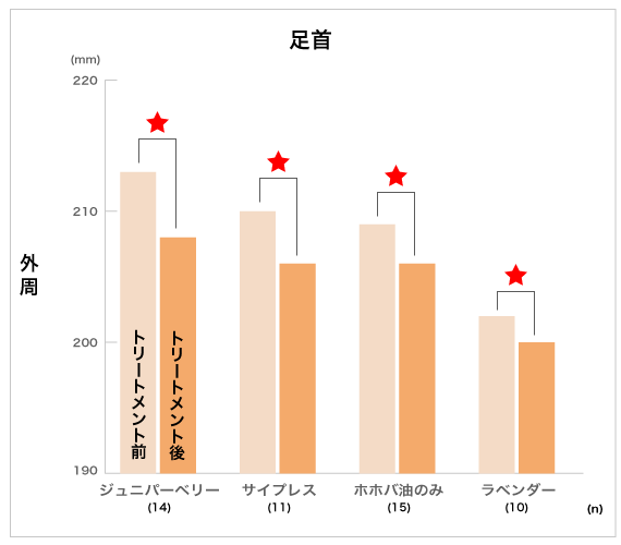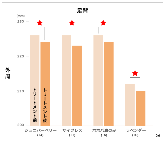 ●⾜⾸、⾜背のサイズでは、ジュニパーベリー、サイプレス、ホホバ油のみの3種で、トリートメント後に有意にサイズがダウンしました。