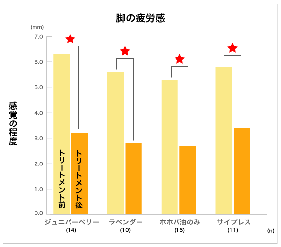 ●脚のむくみ・疲労感・冷えの感覚においては、トリートメントオイル全種で、トリートメント後に有意に軽減されました。