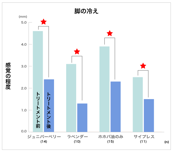 ●トリートメント後にむくみ・疲労感・冷えの感覚を最も軽減したのは、ジュニパーベリーでした。