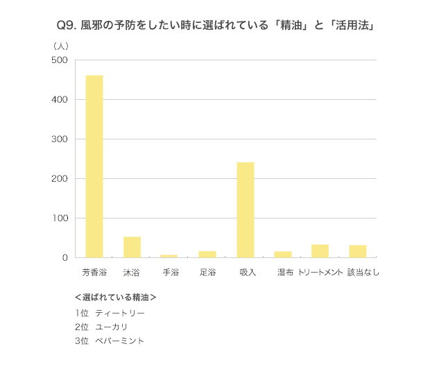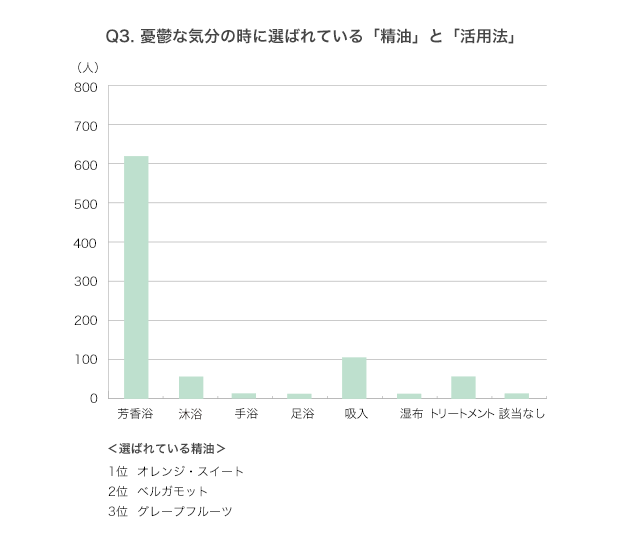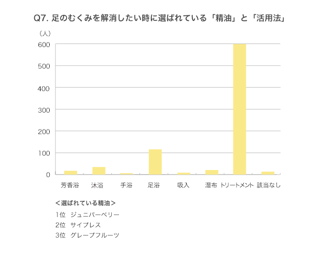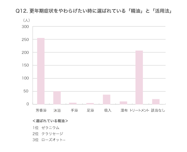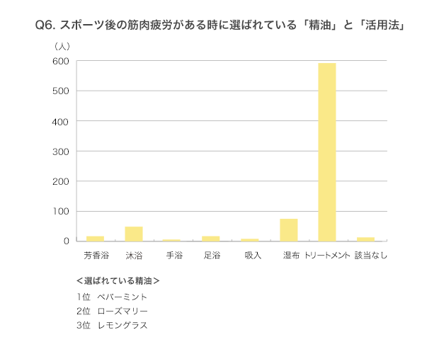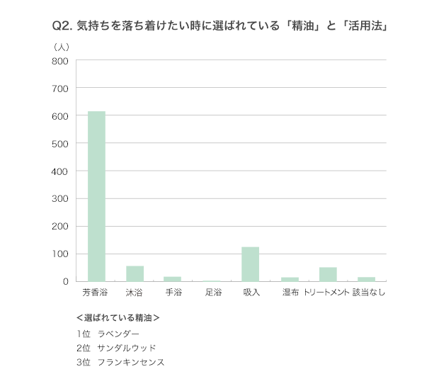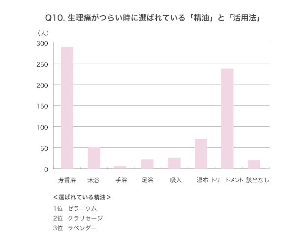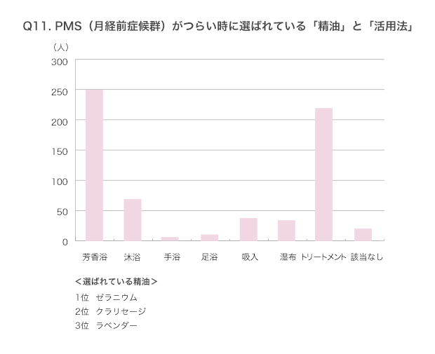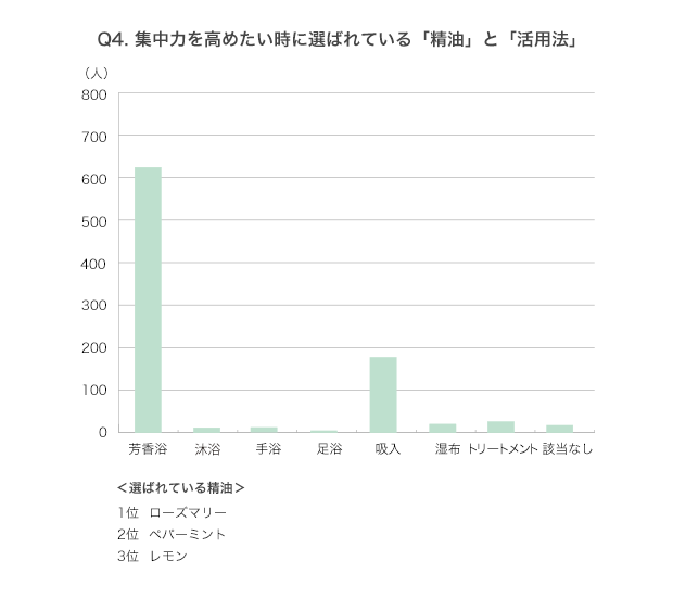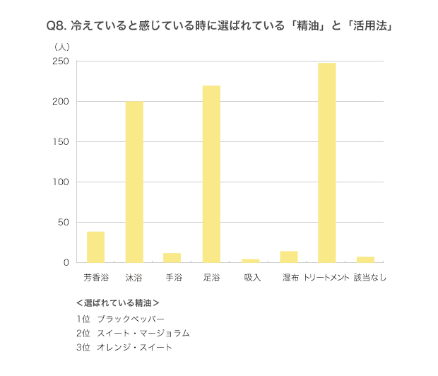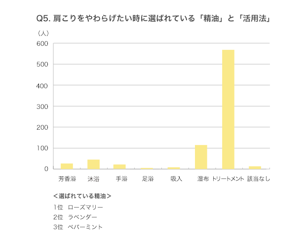 セルフケアにおいてご自身の経験に基づき、心や身体の状態別(寝つき・集中力・肩こり・むくみ・冷えなど)に最も効果があると感じている精油と活用法は、以下の通りとなりました。