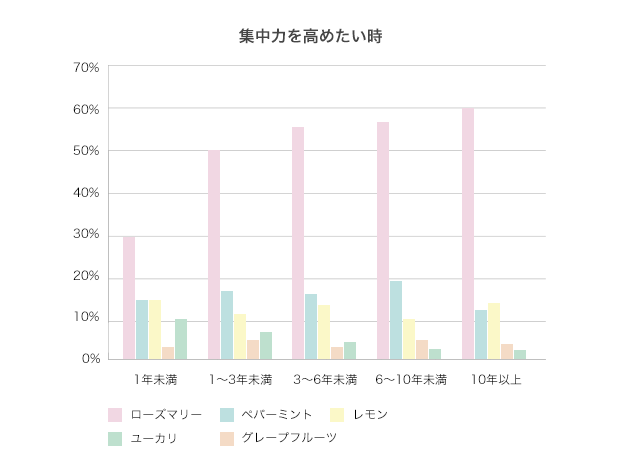 「集中力を高めたい時」の上位5つの精油について、アロマテラピー実践歴別にみたところ、実践歴が長くなるとローズマリーの割合が高くなる傾向がみられました。