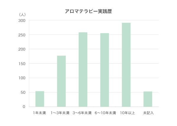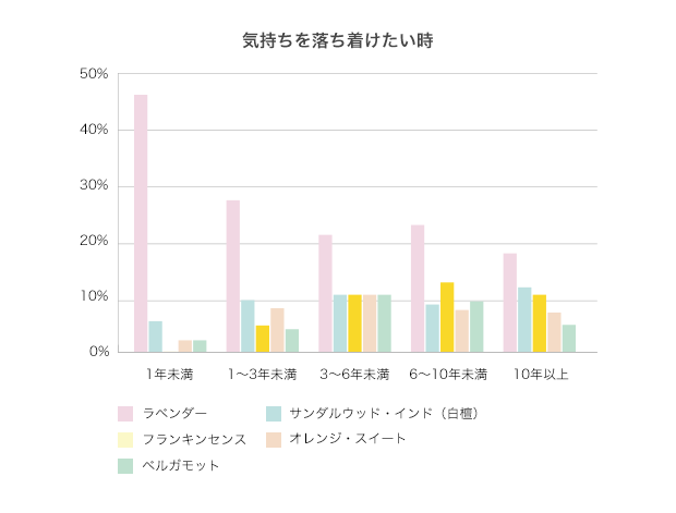 「気持ちを落ち着けたい時」、実践歴1年未満ではラベンダーに集中していますが、他の実践歴では、複数の精油に分散する傾向がみられました。