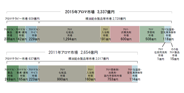 2015年のアロマ市場規模は3,337億円で、そのうち、アロマテラピー製品・サービス等による市場規模は609億円、精油を配合した製品等による市場規模は2,728億円と推計されました。