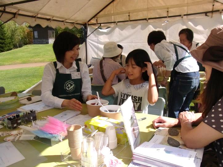 AEAJ として出展する初めての北海道でのイベント。今回の実施にあたっては、地元の会員の方が中心となり、企画、準備、実施まで、全てを担っていただき、ドライラベンダーとローズを使ったサシェ作りを実施しました。当日は行列が出来るほど盛況で、多くの方に体験していただくことができました。ご協力いただいた会員の方々からは「インストラクターの資格を初めて活かすことができ、一般の方の反応や行動を目の当りにして、実践の勉強になった。」「地域の会員の方々と一緒に実施することで繋がりができて嬉しい」「もっとやってほしい」などといった感想をいただきました。