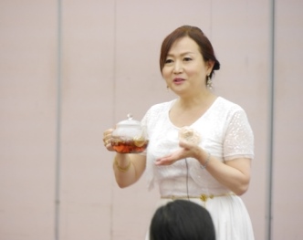 セミナー1では、「香りの植物ハーブで五感を磨く!バラづくしのハーバルセミナー」と題し、ハーブスペシャリストの榊田千佳子先生にお話しいただきました。まずは、この日のために特別にブレンドされたハーブティーと先生お手製のバラジャムのおもてなしがありました。それぞれのレシピの解説の後、ハーブティーのいれ方のデモンストレーションが行われました。美味しくいれるポイントは、あらかじめポットやカップを温めておくこと。こうしたコツをおさえるだけで、味に違いが生まれるそうです。続いて、ドライハーブをホームエステに役立てる方法を紹介。参加者の方に協力していただき、バラのフェイシャルスチームのデモンストレーションを行いました。また、バラとオートミールで作製したフェイシャルパックを、皆さんに顔の代わりに手の甲で感触を試していただきました。