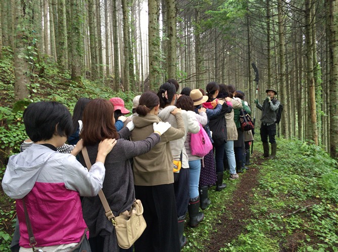 目をつぶって森を歩きました。足元の感触、鳥の声、植物の香りなど視覚以外の感覚を使って、森を感じます。