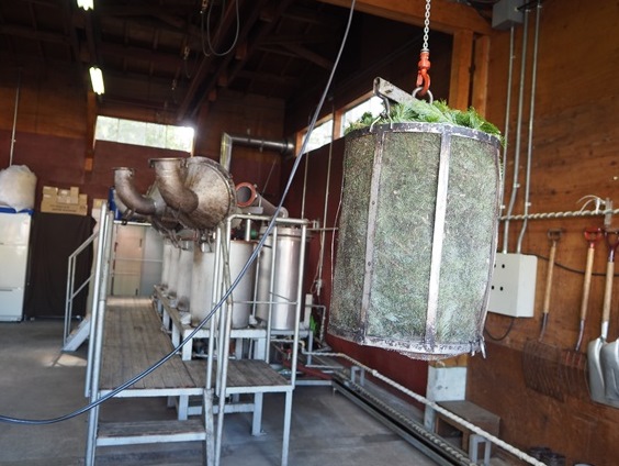 トドマツが入ったカゴをクレーンを使って蒸留器へ。蒸留器のフタを締めて、蒸留開始です!