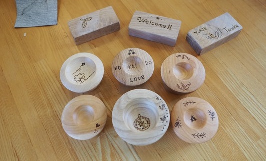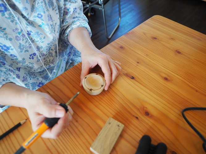 蒸留を待つ間にオリジナルのアロマプレート作りを実施。木製のプレートに、文字や絵が焼きつけられる「バーニングペン」を使って模様をつけていきます。