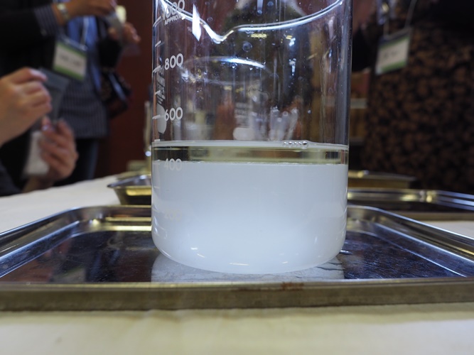美味しいフレンチの昼食をはさんで、蒸留が終了。お待ちかねの蒸留器のフタが開きました!できたての香りが辺りにふんわり漂います。