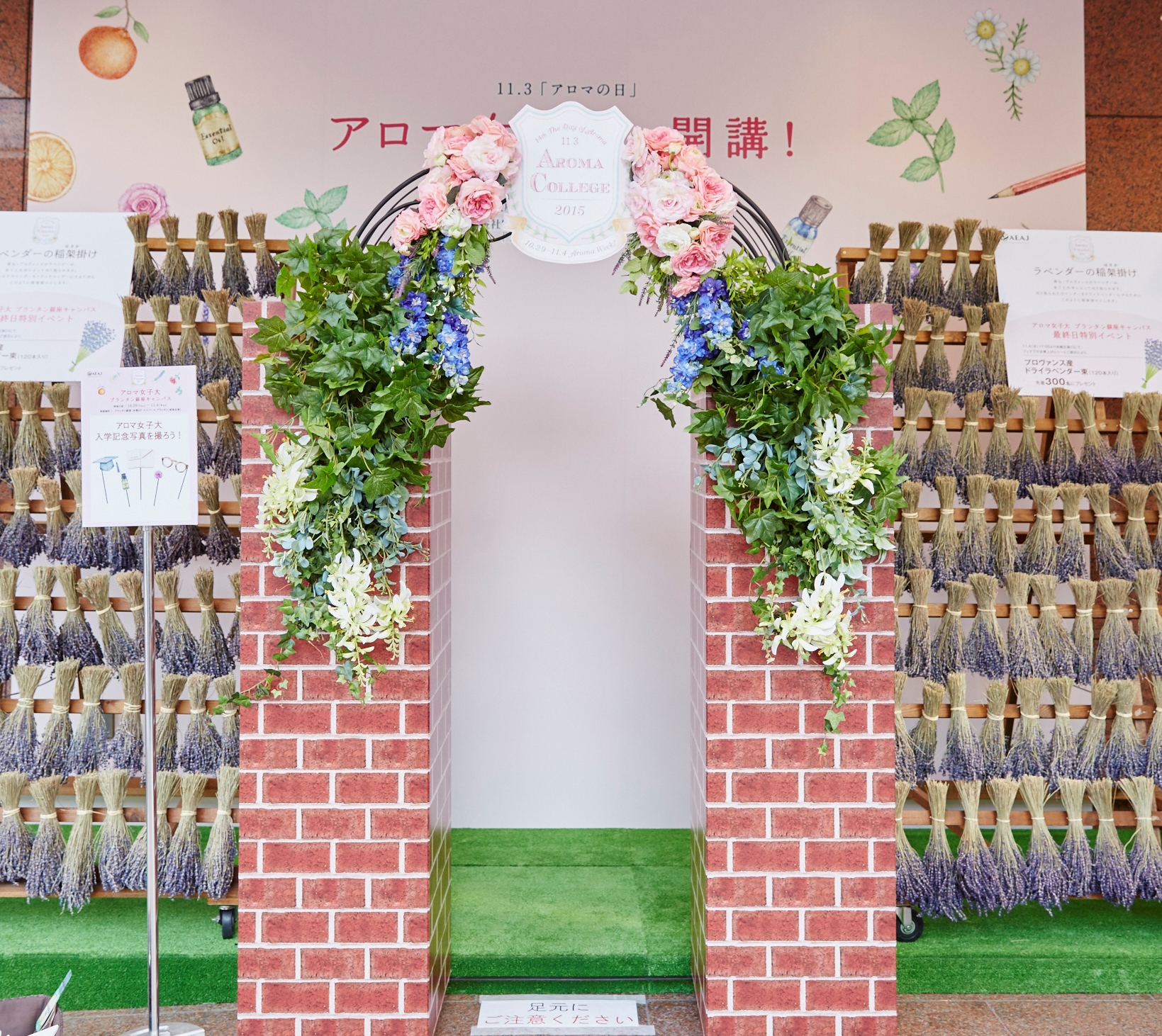 10月29日~11月4日には、プランタン銀座にて、アロマテラピーフェアを開催しました。毎年大好評のこの催しに、今年も多くの方にお越しいただきました。プランタン銀座の正面入り口には、アロマ女子大入学フォトスポットが出現し、来場者の方が、お友達と記念撮影をされている場面も。会場には、関連ショップ約26店舗が一堂に会し、各社おすすめ商品やフェア限定セットなど、お得な商品が販売されました。経験豊富な店頭スタッフのアドバイスで、アロマ初心者の方も、自分に合ったアロマグッズを見つけることができたようです。AEAJ認定アロマテラピーインストラクターによる、アロマ女子大体験入学コーナーでは、フラワー系、ハーブ系、シトラス系、ウッド系の4つのカテゴリーから、好きな香りを選んで、オリジナルアロマバスソルトを作っていただきました。多くの方にアロマテラピーに興味を持っていただく機会となりました。