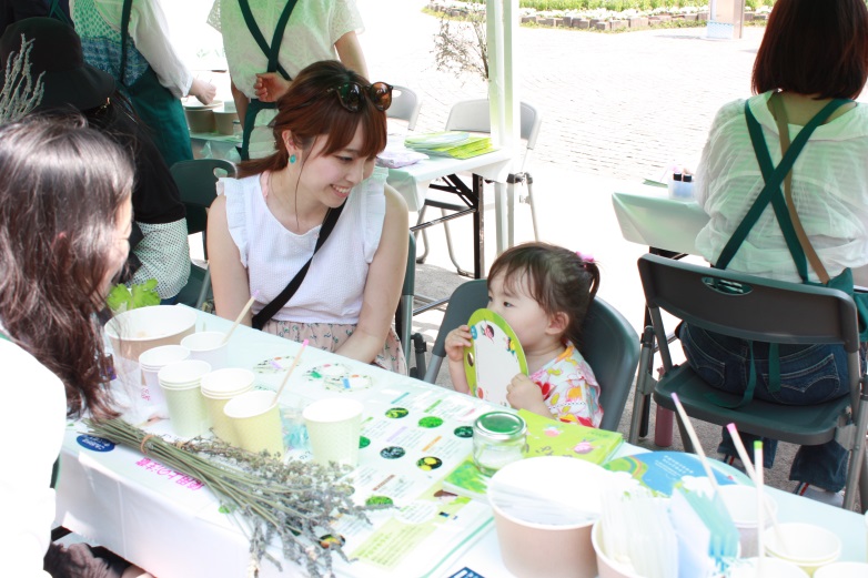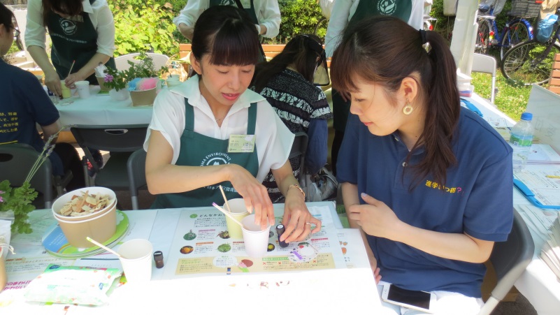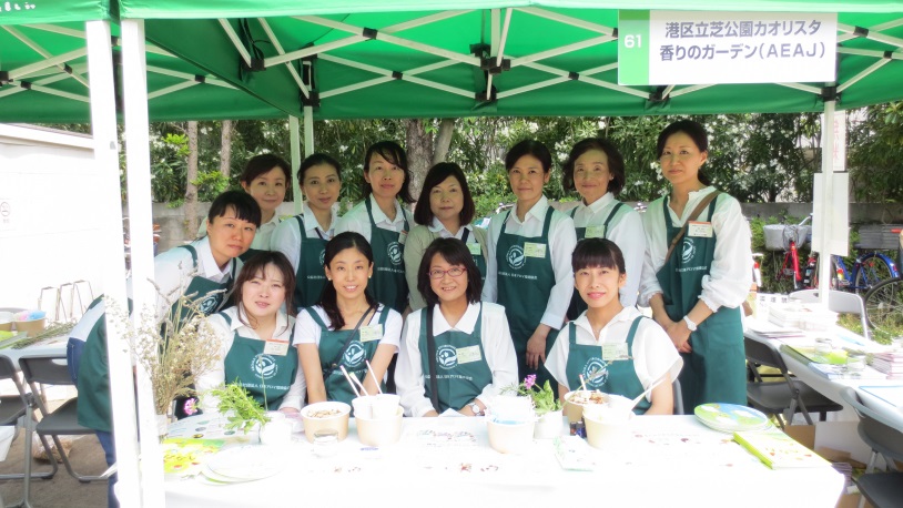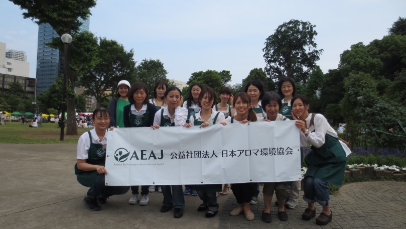 AEAJ会員スタッフの協力のもと、港区立芝公園にて開催された「第12回ふれ愛まつりだ、芝地区!」に出展。芝公園内「環境カオリスタ香りのガーデン」で育てているハーブについて紹介ながら、ハッカ、ゼラニウム、ラベンダーの精油を使用したウッドチップサシェ作りを実施しました。当日は梅雨の晴れ間の夏日となったため、ハッカの香りが大人気に。「お花の香りとスース―する香り。両方でいいね」といってくれた小さな女の子や、「いつも嗅いでいるけど、今日は暑いからハッカの香りがいいわ」といった年配の方まで、幅広い年代の方々に楽しんでいただきました。