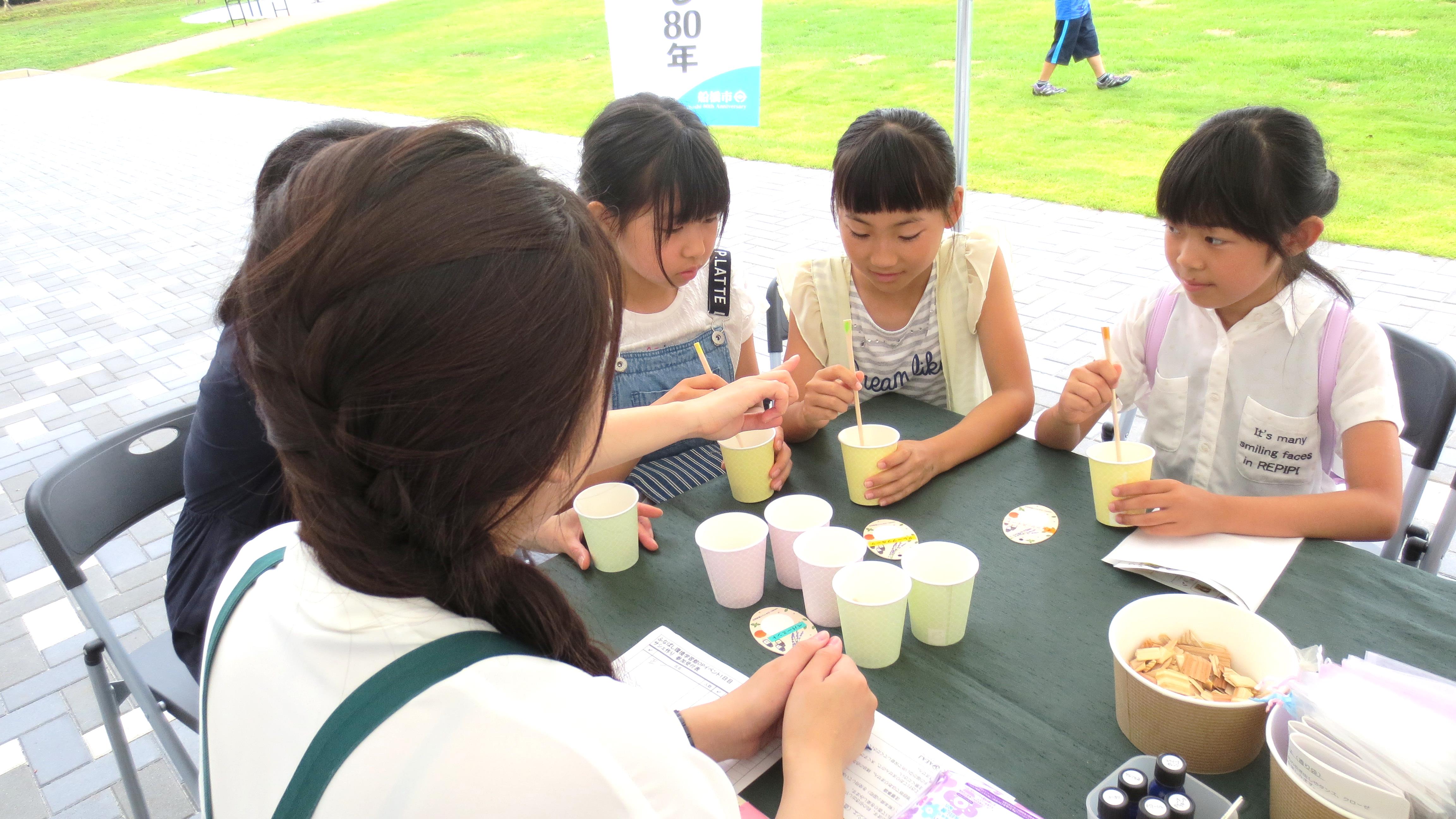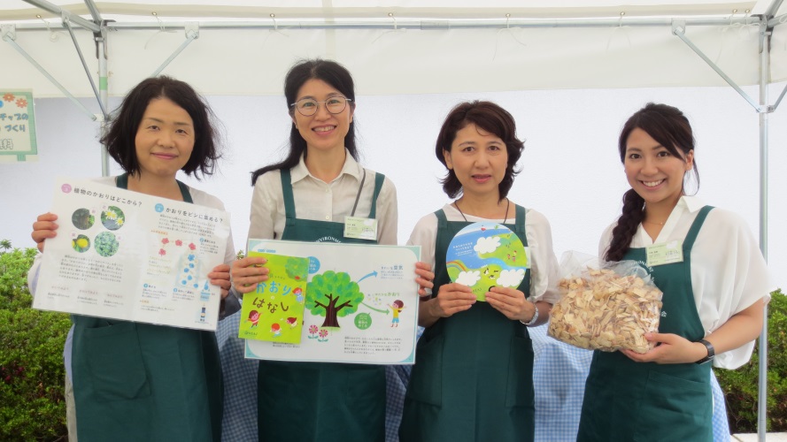 AEAJ会員スタッフの協力のもと、自然体験や環境学習ができる「ふなばし三番瀬環境学習館」のオープニングイベントに出展。ウッドチップサシェとかおりのうちわ作りを実施しました。蒸し暑い気候だったため、オレンジ・スイート、グレープフルーツといった柑橘系の香りとともに、すっきりとしたペパーミントも大人気に。参加者はご家族連れが多く、「パパはグレープフルーツの香りにしようかな。ママはオレンジの香りだね」と香りの違いを楽しみながら、サシェ作りをされていました。また、オレンジ・スイートやゼラニウム、ユーカリの好きな香りで作るかおりのうちわも大好評。皆さまパタパタと仰ぎ、「わあ、いい香り!」といいながら涼まれている様子が印象的でした。