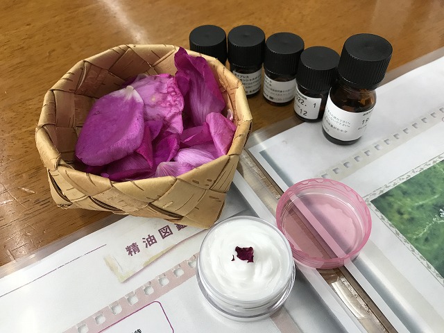 現在園内では、北海道の花にも指定されていて、バラの一種でものあるハマナスが最盛期を迎えています。今回はハマナスの花を蒸留し、そのフローラルウォーターを使ったハンドクリーム作りを行いました。蒸留をはじめると、会場内はバラの甘く華やかな香りにつつまれ、参加者も笑顔に。なかなか見ることのできない蒸留の様子にも興味津々の様子でした。