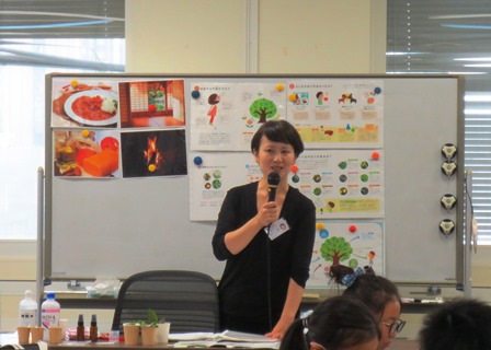 講座では、身の回りの香りがなくなるとどんな影響があるのか、また植物の香りの役割、地球環境の変化で植物が育たなくなってしまうと私たちの暮らしはどうなってしまうのかなどをお話ししました。さらに、ペパーミント、レモングラス、オレンジ・スイートを使用したアロマスプレー作りも実施。