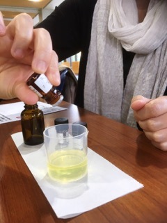 今回は「椿オイルとアロマでケアするヘアケアの会」と題した講座を実施。椿オイルをベースに、ラベンダー、ローズマリー、ゼラニウム精油をブレンドし、ヘアオイルを作成。そのほか、ヘアケアや頭皮マッサージ方法についてもご説明しました。