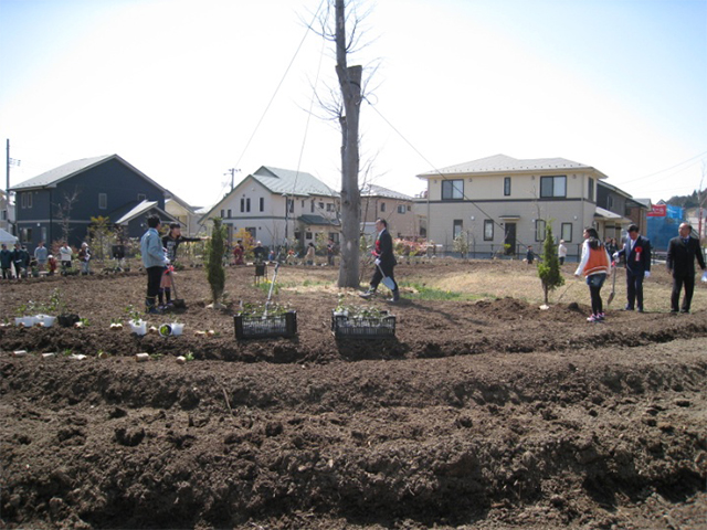 宮城県利府町葉山は、日本三景のひとつ松島にほど近く、番が森の麓に位置する住宅地です。住民のコミュニケーションの場となるようにと、5年前に街の中心の緑地に植樹を行いましたが、地下水と土壌の影響で樹木の成長が思わしくありませんでした。そこで、街の住民、事業者、行政が協力し合い、緑地の再生にチャレンジしたのが、今回の受賞企画です。