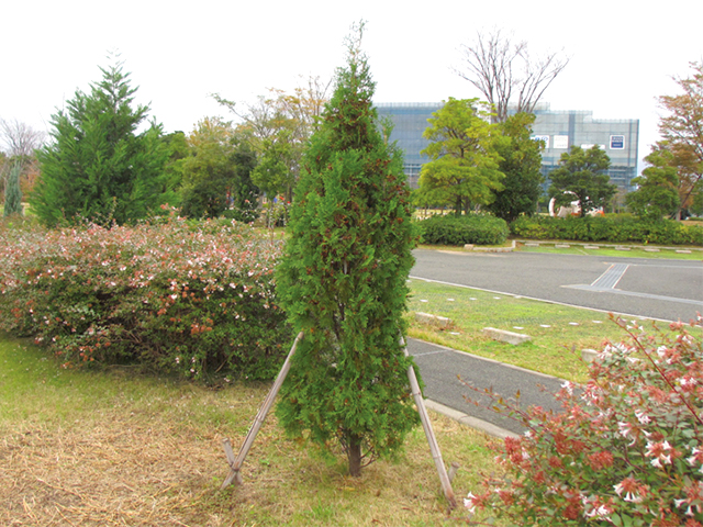 柑橘系の香りを放つニオイヒバが園路に沿って植えられている