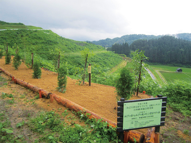 棚田に沿ってキンモクセイとニオイヒバを植樹。「マイ記念樹」として植樹した人のネームプレートが付けられている
