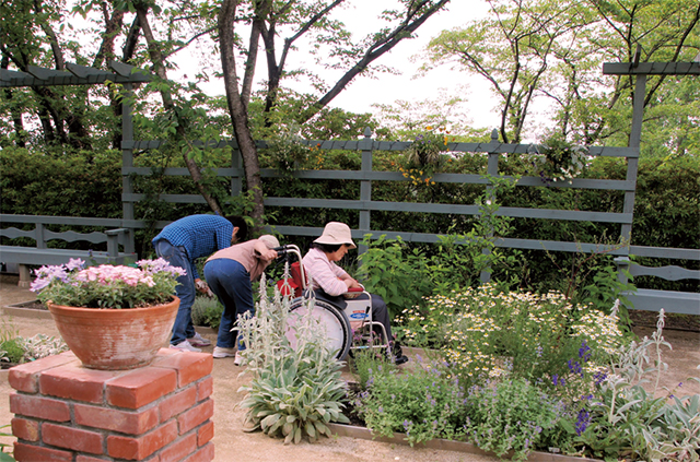 車いすの人がガーデンを回ると、ちょうど手を伸ばした高さにさまざまな植物があり、触って香りを楽しむことができます。また、視覚障がいを持つ人は、目で見ることのできない四季の変化を香りで感じられる、と大変喜んでいます。