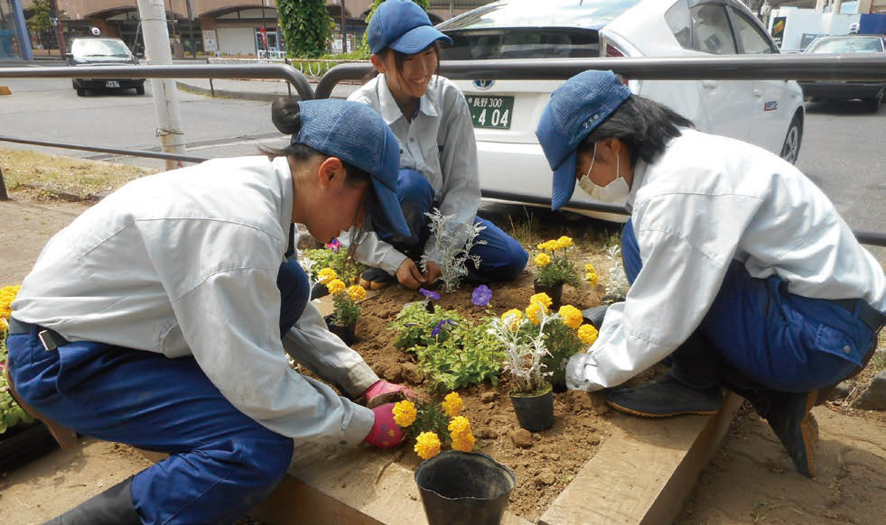 その後、年に1回、長野電鉄の社員の方と共同で花壇の草取りや剪定、植え替えを行っています。植え替えは6月の上旬に1年間そのままにしていた花壇を掘り起こし、ペチュニアやマリーゴールドなどの新しい夏用の花を植えています。広場は以前に比べて明るくなり、訪れる人が増えました。これからも地域の皆さんの憩いの場づくりに協力していきたいと思います。