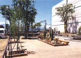| 完成したショッピングセンター前広場の様子。 カツラ、ニオイヒバ、バラ、クチナシ、 ロウバイが植えられている。 |