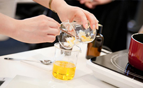 各自選んだ香りで、早速ミツロウクリーム作りをスタート。ミツロウと植物油を混ぜながら湯煎をし、お好みの精油を入れて混ぜれば、あっという間に完成です。思ったより簡単にできるオリジナルのクリーム。香りのアレンジはもちろん、ミツロウと植物油の比率を変えることで、好みや用途に合わせてテクスチャーを調整できるのも、手作りならでは。皆さんからはもっと手作りコスメにチャレンジしてみたいという声が上がりました。また、先生に疑問点をどんどん質問したり、完成したクリームの違いを比べ合ったりと、キラキラとした瞳で意欲的に取り組む様子から、アロマテラピーを学ぶことが楽しくて仕方がないという気持ちが伝わってきました。