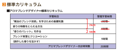 中面右ページの「アロマブレンドデザイナー標準カリキュラム」の管理学習時間について、